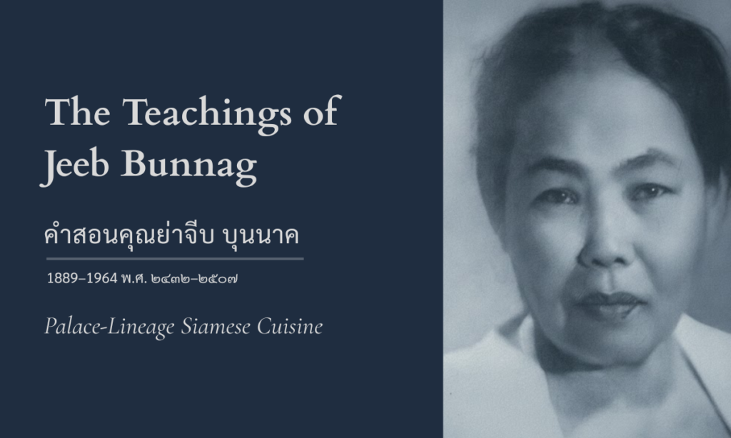 | The Teachings of Jeeb Bunnag | – ตำรากับข้าว – สำรับรอบปี – ตำราอาหารว่าง – เครื่องน้ำชา และ เครื่องเคี้ยว หรือ กับแกล้ม | Various Publications | นางสมรรคนันทพล (จีบ บุนนาค) | Mrs. Samaknantapol (Jeeb Bunnag) | 1933-1954 | Siamese aristocratic cuisine | In progress |