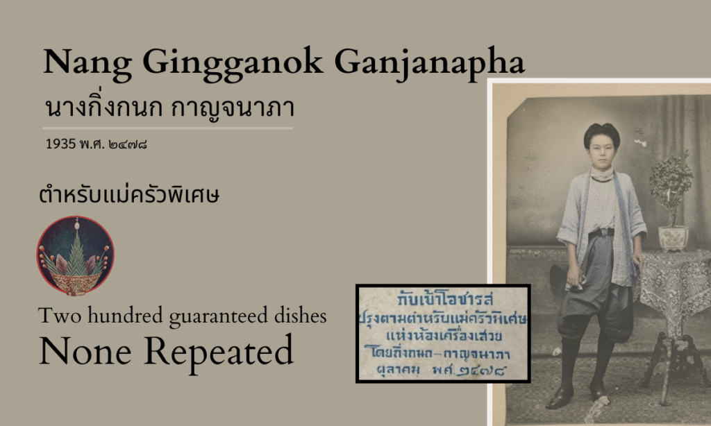 What survives is the collection itself: over two hundred preparations representing what Gingganok and her collaborators understood as royal kitchen cooking in the mid-1930s (พ.ศ. ๒๔๗๐). The recipes document technique, proportion, and method as these women knew them. Whatever biographical questions remain open, the cooking knowledge is present on the page.